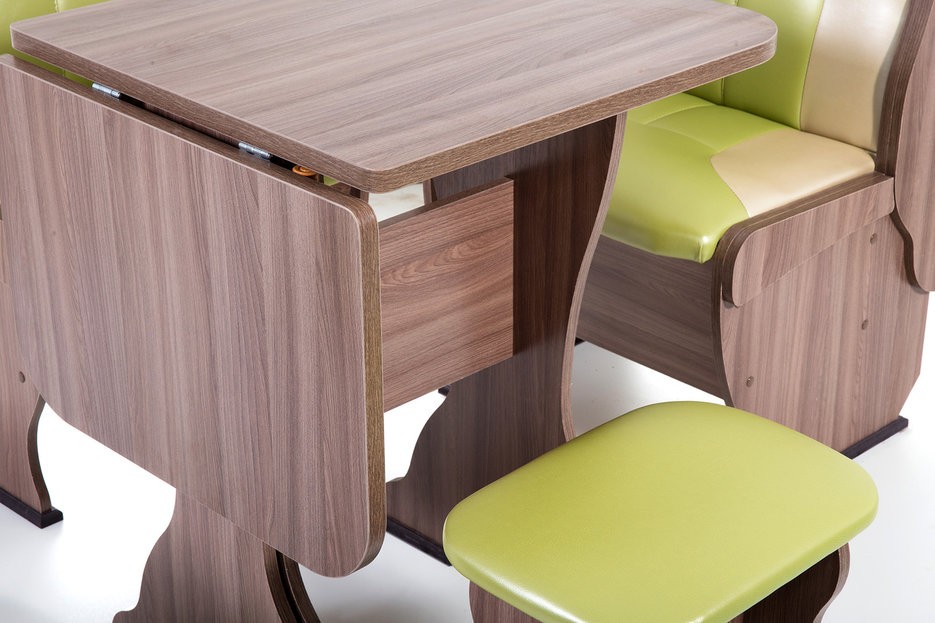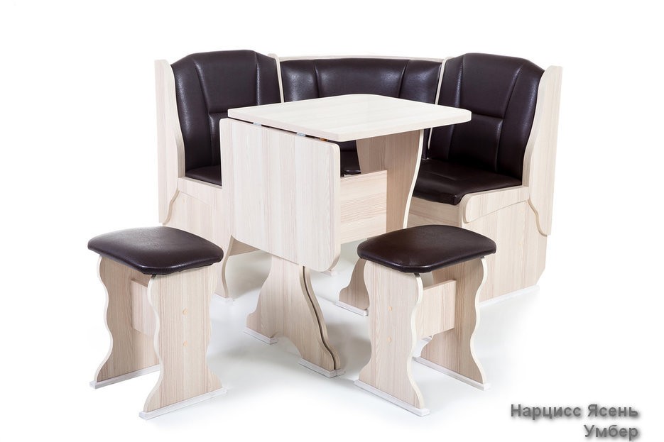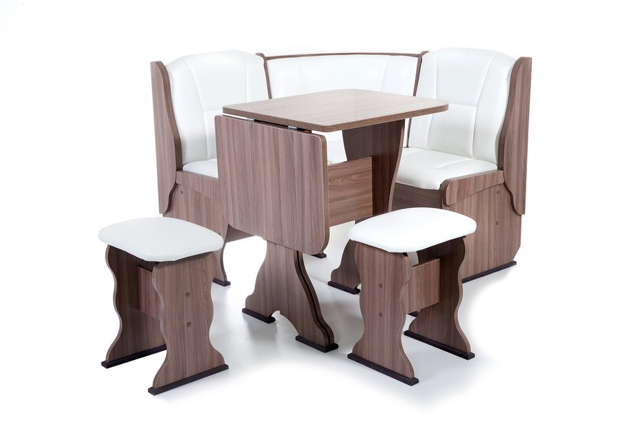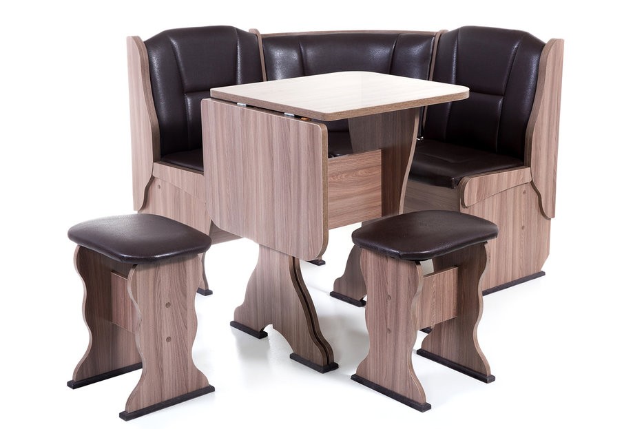 Особенности уголка: Поможет обустроить комфортную обеденную зону без лишних затрат. В гарнитур входит угловой диван, два табурета и раскладной стол. В угловой части дивана есть удобная полочка, на которую можно поставить нужные вещи. Под сидениями находятся вместительные ящики для хранения. Имеет термостойкую пластиковую столешницу. Угол собирается как в правом, так и в левом исполнении. Размеры: Размер угловой скамьи: ш(1080х1080)хг530хв880 мм. Размер стола: ш625(1000)хг580хв750 мм. Размер табурета: ш380хг300хв450 мм. Высота уголка: 880 мм. Высота посадки скамьи: 465 мм. Высота табурета: 450 мм. Высота стола: 750 мм.